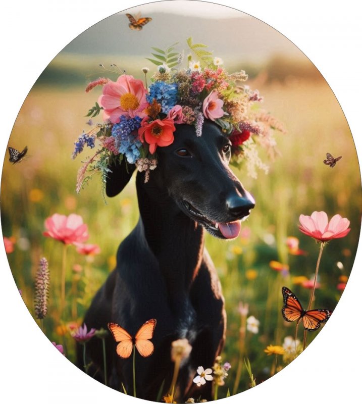Aufkleber Galgo mit Blumenkranz in der Größe ca. 11x10cm