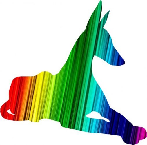 Aufkleber - Liegender Podenco in Regenbogenfarben. Das Motiv ist Kontur geschnitten.